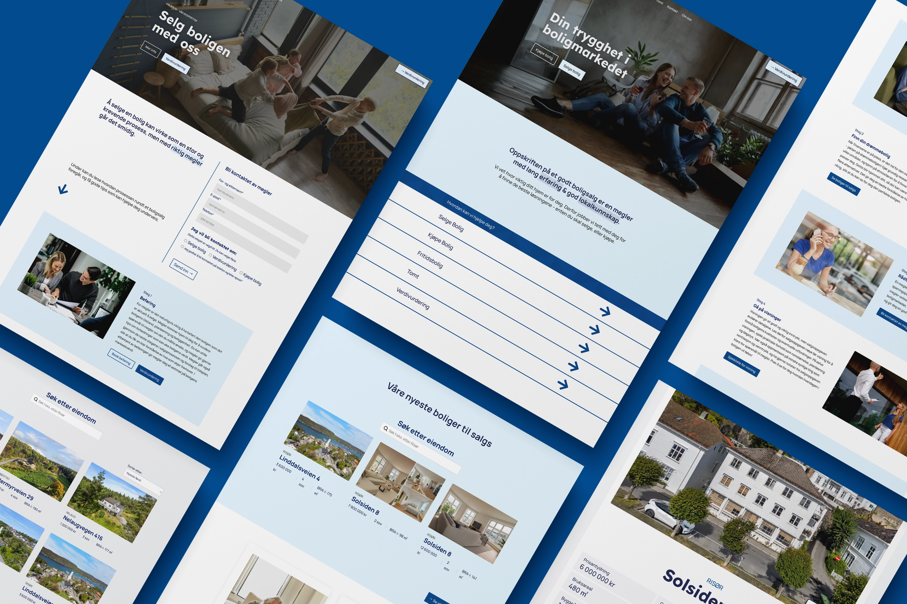 I prosessen utviklet jeg en struktur som forklarer prosessene på en enkel og pedagogisk måte, slik at det føles tryggere å velge dem som megler. Designet er moderne og fresh, men samtidig jordnært og tillitsvekkende.